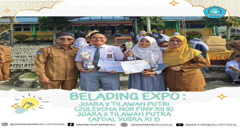SMAN 4 Mandau mengucapkan selamat kepada siswa dan siswi yang telah berhasil menjuarai pada perlombaan yang diadakan oleh Ponpes Modern Ibadurrahman Belading pada event Belading Expo 21 - 24 Oktober 2024.