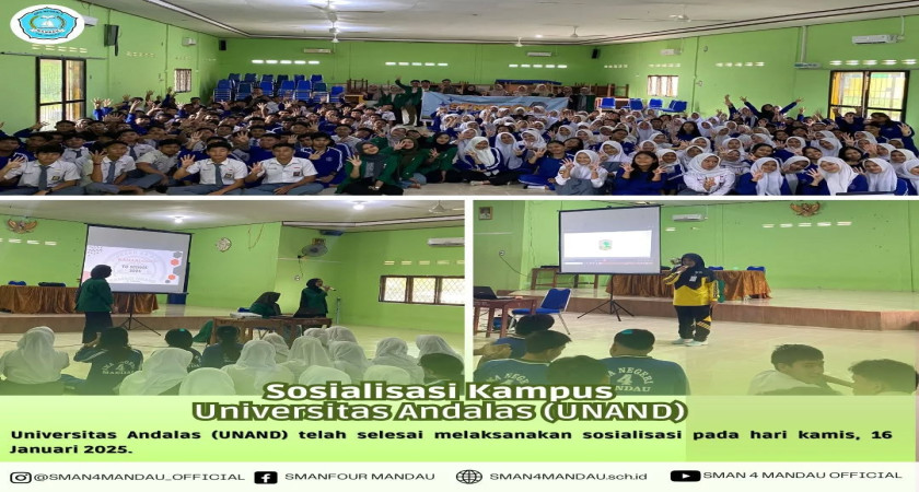 Kamis, 16 Januari 2025. Universitas Andalas (Universitas Andalas) mengadakan sosialisasi kepada siswa/siswi kelas XII di Aula SMAN 4 Mandau. Dengan diadakannya sosialisasi siswa /siswi kelas XII dapat lebih menambah wawasannya mengenai perkuliahan khususnya mengenai kampus Universitas Andalas, dan juga harapan kedepannya siswa/siswi SMAN 4 Mandau banyak yang lulus di kampus impiannya ????