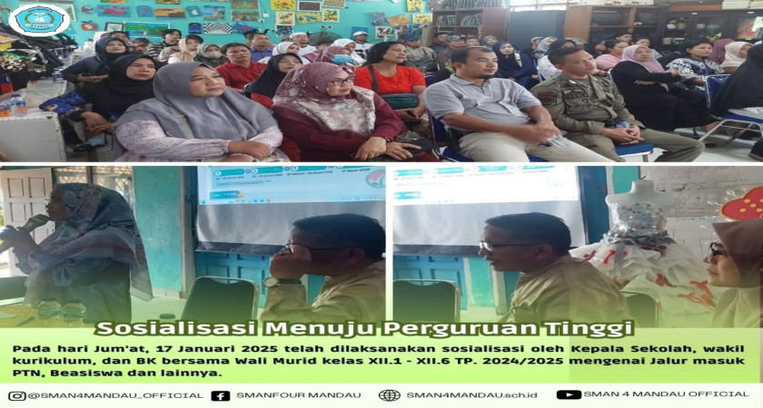 Pada hari Jum’at, 17 Januari 2025 telah dilaksanakan sosialisasi oleh Kepala Sekolah, wakil kurikulum, dan BK bersama Wali Murid kelas XII.1 - XII.6 TP. 2024/2025 mengenai Jalur masuk PTN, Beasiswa dan lainnya.