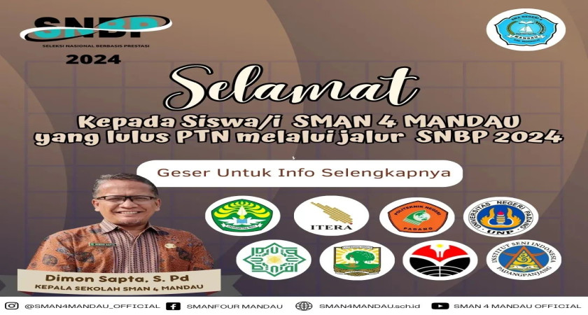 Segenap civitas akademik SMAN 4 Mandau mengucapkan selamat dan sukses atas diterimanya ananda ke perguruan tinggi negeri jalur SNBP tahun 2024.
