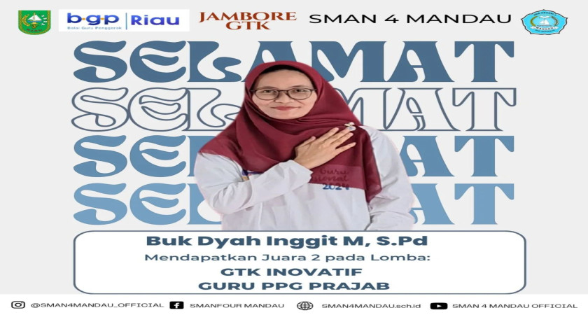 Selamat kepada Buk @dyahinggit_dim telah meraih Juara 2 pada lomba JAMBORE GTK untuk kategori GTK INOVATIF GURU PPG PRAJAB, ibuk inggit sungguh menginspirasi kita semua, dan ngak lupa sudah mengharumkan nama sekolah kita SMAN 4 MANDAU ????☺????????